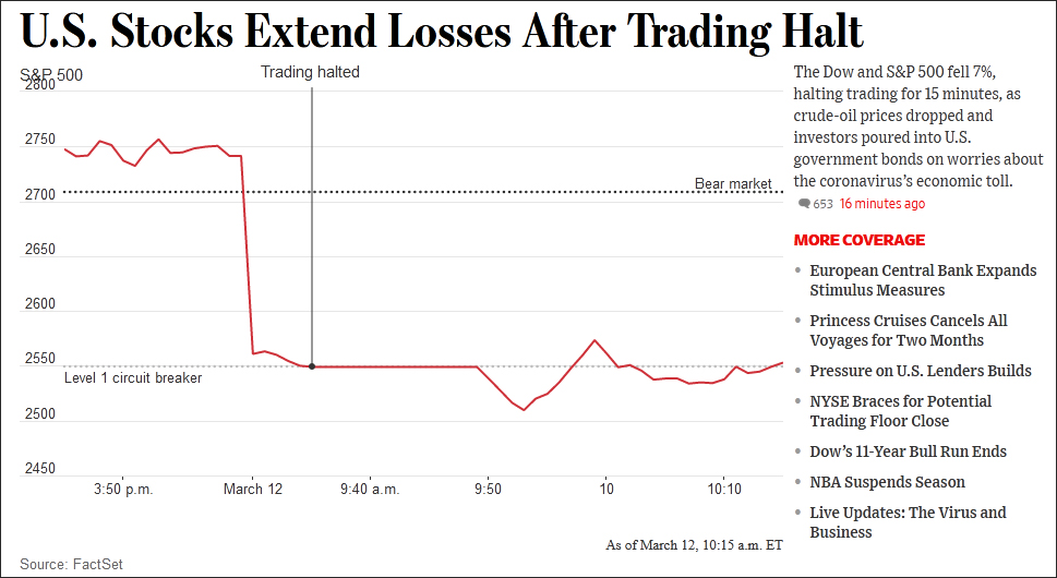 開盤5分40秒後,標普500指數跌幅擴大至7%,觸發本週第二次熔斷,美股暫停交易15分鐘。