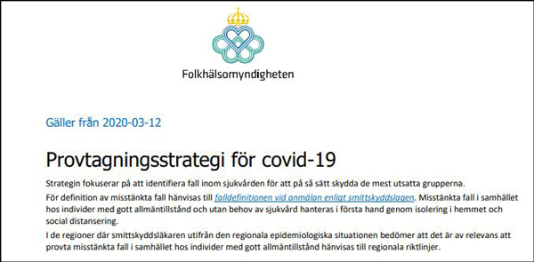 新冠病毒檢測政策調整 圖自瑞典公共衞生局(下同)