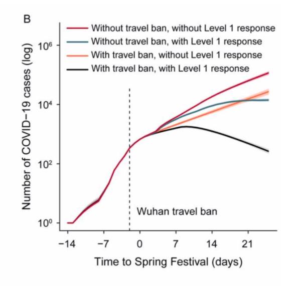 研究得出的結論為:武漢出行禁令和國家緊急響應推遲了疫情增長,最終限制了COVID-19疫情的規模。據估計,武漢的封城將疫情擴散到其他城市的時間推遲了2.91天(95%置信區間:2.54-3.29),從而推遲了中國其他地區的疫情增長。而和啓動控制措施較晚的城市相比,提前採取措施的城市在疫情暴發的第一週報告的病例數減少33.3%。在這項調查的干預措施中,最有效的是暫停市內公共交通、關閉娛樂場所和禁止公共集會。
