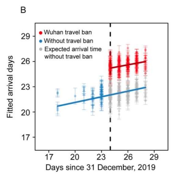值得注意的是,這項分析認為沒有證據可以表明,1月23日武漢頒佈出行禁令之後實施的城市間出行禁令可以減少中國武漢和湖北外其他城市的病例數量。