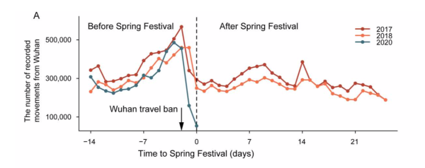 研究團隊首先調查了武漢出行禁令的影響,將2020年的出行情況與前幾年進行了比較,並探討了假期出行對中國各地傳播感染的影響。