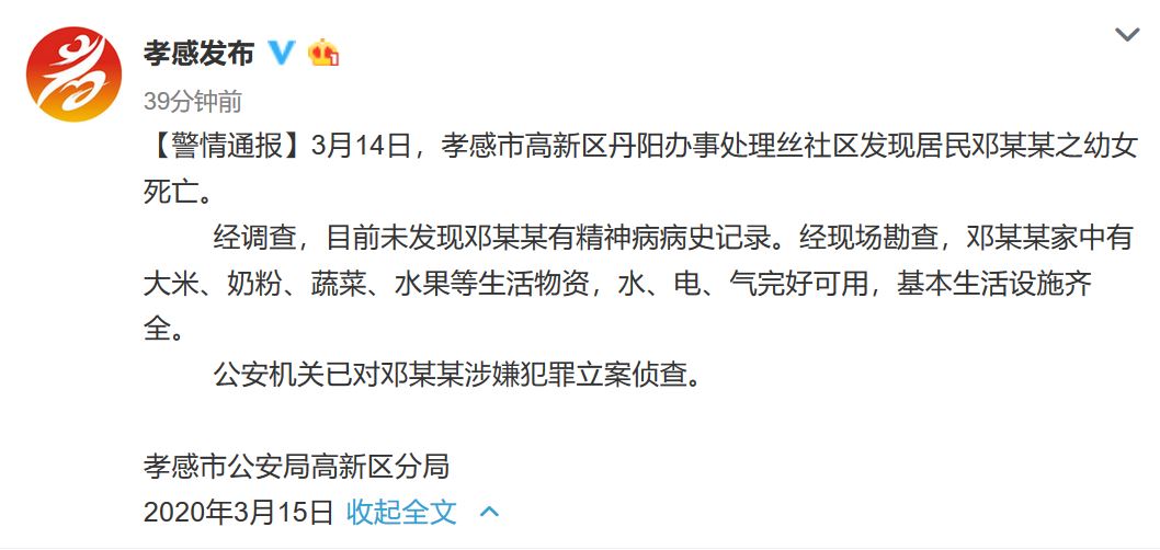湖北省孝感市公安局高新區分局 15日通過孝感市人民政府新聞辦公室官方微博(@孝感發布)發佈通報稱,3月14日,孝感市高新區丹陽辦事處理絲社區發現居民鄧某某之幼女死亡。