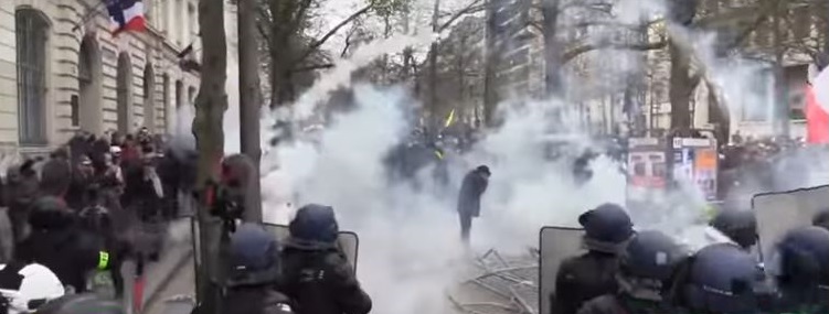 根據“今日俄羅斯”法國版上傳的視頻顯示,防暴警察使用催淚瓦斯和震撼彈試圖驅散人羣,還有部分示威者與警察發生肢體衝突。法國警方在推特上稱,截止當天下午6點40 ,共有79人被捕。