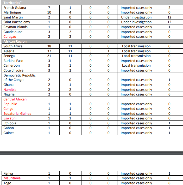 世衞組織非洲地區新冠數據截圖 紅字為新增國家