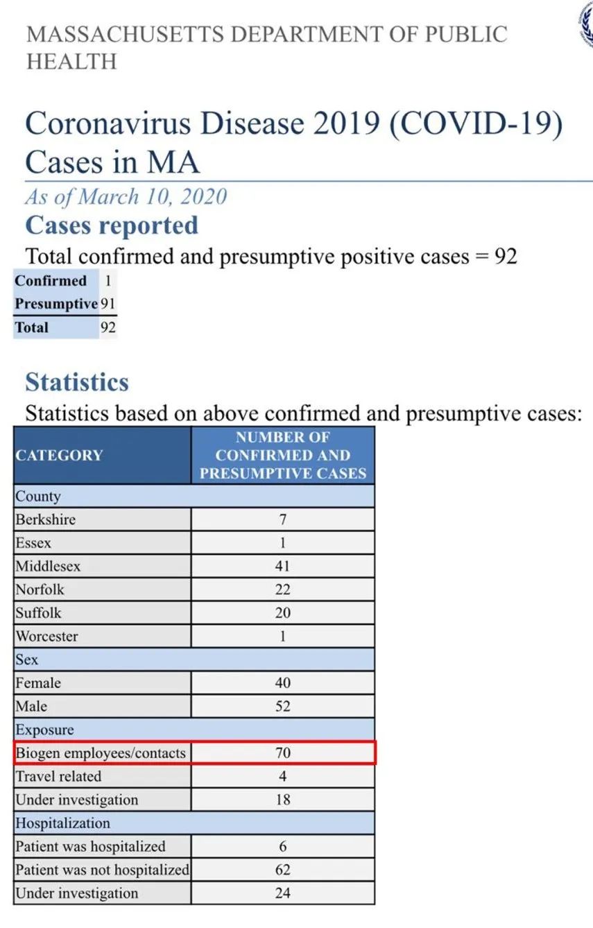 圖:據馬薩諸塞州綜合醫院統計,截至3月10日,麻州共出現92例新冠病毒感染(1例確診,91例疑似),其中來自Biogen的病例共70例(見紅框)。