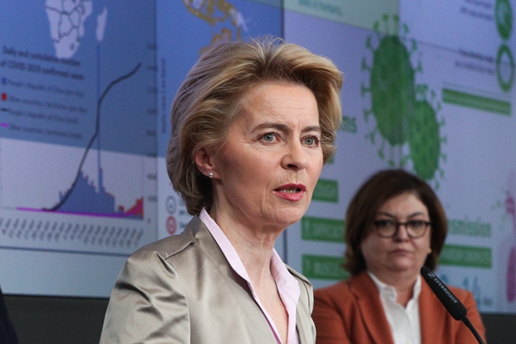 3月2日,在比利時布魯塞爾,歐盟委員會主席馮德萊恩在有關新冠病毒疫情的新聞發佈會上發言。馮德萊恩表示,新冠病毒持續在歐洲傳播,歐洲疾病預防與控制中心已將疫情風險等級從“低度到中度”上調為“中度到高度”。(@新華社)