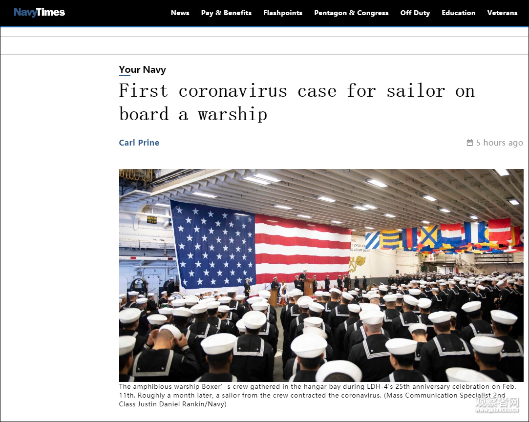 美國海軍表示,這是美國海軍首次有軍艦艦員新冠病毒檢測呈陽性,也是聖迭戈海軍基地發現的第二例。此前據美國海軍時報3月7日報道,美國海軍一名駐意大利那不勒斯海軍基地的美國水手確診新冠病毒,這意味着美海軍艦勤和岸勤人員都有新冠檢測呈陽性案例。