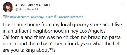 自然,這引發了推特網友的強烈質疑。一名自稱住在洛杉磯富人區的網友反駁努內斯“沒有食物短缺”的説法:“我剛從本地的雜貨店回家,那兒沒雞肉,沒麪包,沒意大利麪,也沒米飯,已經好幾天都這樣了。所以,你到底在説什麼?”