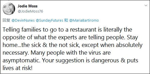 但針對“健康的人”,努內斯宣稱:“由於人們不敢出門,經濟狀況令人擔憂。但我得説,你可以做的一件事是,如果你很健康,那麼對你和家人而言現在是出門的好時機,去你們那的餐館吧。讓我們不要傷害這個國家的勞動者,他們只能依靠工資和小費來維持生計。”