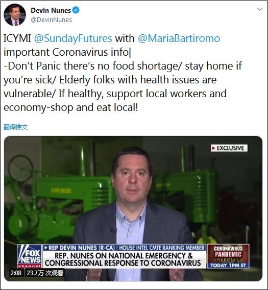 但就在稍早以前,加州眾議員戴文·努內斯竟還號召民眾“外出吃飯”,支持經濟。頗為諷刺的是,努內斯竟然還在同檔節目中無端指責中國“忽視”應對疫情。他的發言也引發了網友的廣泛質疑:你説的和專家説的完全不一樣啊?
