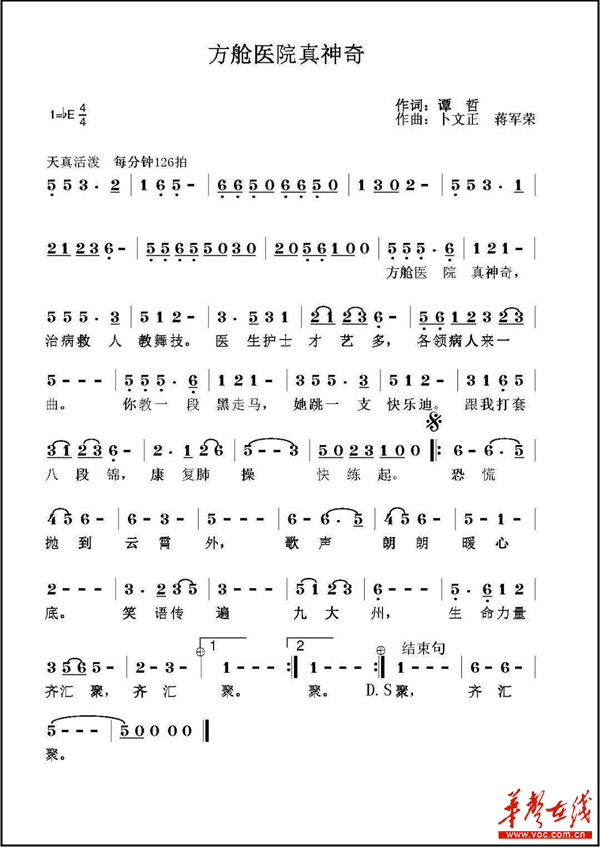 據湖南日報報業集團創辦的“華聲在線網”14日消息,這首以抗擊新冠肺炎疫情為背景的少兒歌曲《方艙醫院真神奇》是湖南長沙瀟湘詩會《湘人湘歌》的徵稿。