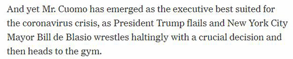 3月16日,《紐約時報》刊登了一篇文章,筆鋒直指如今在全美抗疫中聲量最高的兩位人物,美國總統特朗普和紐約州州長科莫。文章中指出了科莫在此次應對疫情過程中的表現,並拿特朗普與之進行對比。