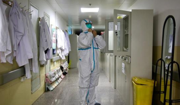 1月22日,武漢大學中南醫院隔離區,醫務人員進入病房前,穿戴好防護服(@楚天都市報)