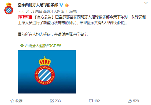 北京時間3月18日凌晨,中國球員武磊所在的西班牙人俱樂部通過微博宣佈,巴塞羅那皇家西班牙人足球俱樂部17日下午對一隊球員和工作人員進行了新型冠狀病毒的測試,結果顯示共有6人結果為陽性。西班牙人俱樂部並未透露感染者姓名。