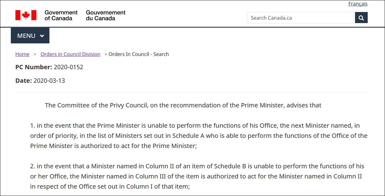 經觀察者網查詢,加拿大樞密院(Privy Council)網站13日曾下達一道政令,若特魯多無法履行職責,政府將實行“國家領導人應急計劃”,由副總理方慧蘭代行總理職責。