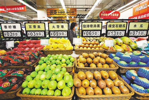 3月17日,居民在河北省邯鄲市永年區美食林超市選購蔬菜水果。 胡高雷攝(中經視覺)