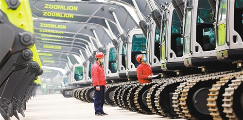 位於陝西省渭南高新區的中聯重科渭南工業園內,檢驗人員對即將出廠的挖掘機檢查驗收。崔正博攝(中經視覺)
