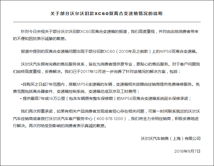 2018年,沃爾沃XC60出現變速器故障,在央視曝光後發表致歉聲明