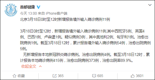 據@首都健康 3月18日消息,北京3月18日0時至12時新增報告境外輸入確診病例11例
