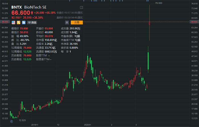 受消息影響,在美上市的BioNTech股價連續三個交易日逆市大漲,3月13日漲8.34%,3月16日漲29.32%,3月17日漲66.5%。