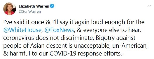18日,沃倫在推特上寫到:“對白宮、福克斯新聞,還有任何在聽的人,我説過一遍了,並且還要大聲説一遍:新冠病毒(對所有人)一視同仁。任何針對亞裔的偏見都是不可接受的,也不符合美國精神,並且對我們的新冠疫情工作有害。”