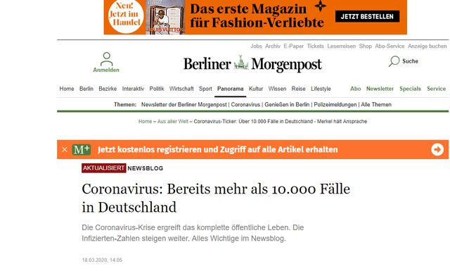 德國確診病例增至10082例 成全球第5個確診人數破萬國家 None 2020-03-18 據德國《柏林晨郵報》報道,德國新冠肺炎確診病例已突破1萬例。另據美國約翰斯·霍普金斯大學最新發布的數據顯示,德國累計確診新冠肺炎病例10082例,死亡26例,治癒73例。 (海外網 王珊寧)