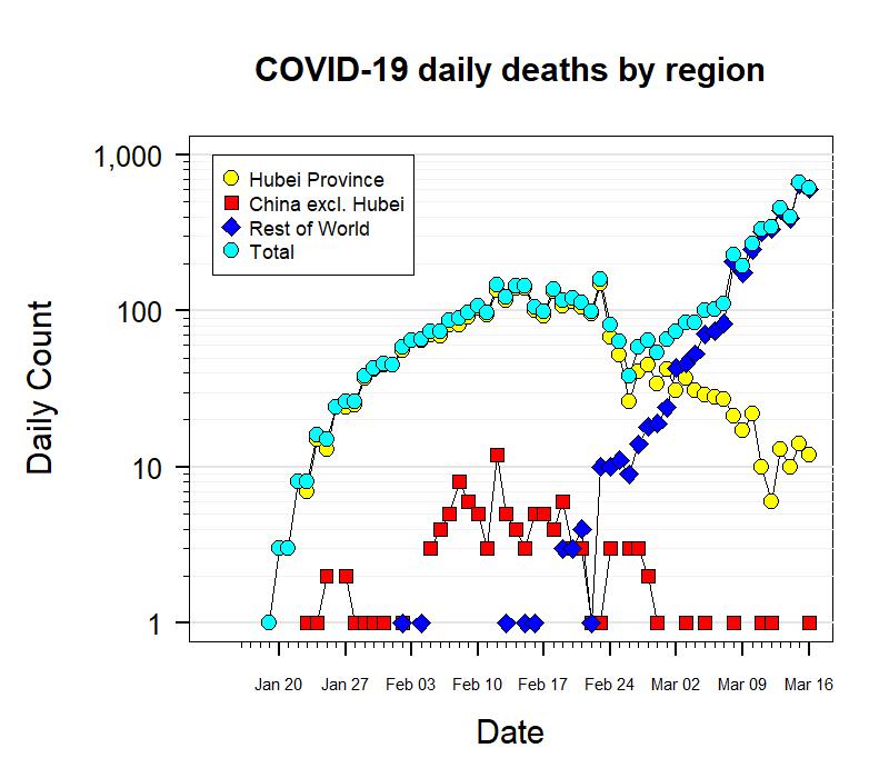 中國以外COVID-19累計確診人數和死亡人數雙雙超過了中國之後,客觀上形成了中國湖北疫情、中國湖北以外疫情和中國以外疫情三個不同疫情發展曲線的對比。