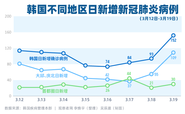 報道稱,疫情中心大邱市仍然佔據了新增病例的大頭,新增97個病例,此後是京畿道18例,首爾市12例,慶尚北道12例。這是大邱、慶北兩地在新增病例數連續7日低於100後首次突破100,首都圈(首爾、仁川、京畿道)的新增病例數也維持了連續8日高於20的勢頭。