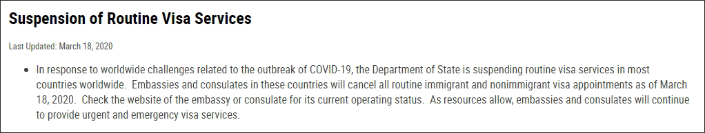 “從2020年3月18日起,駐絕大多數國家的使領館將取消所有正常移民或非移民簽證預約。請查閲各使領館網站以瞭解其目前的工作狀況。”