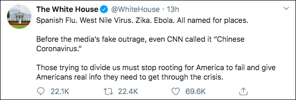 當地時間18日下午,白宮在推特上試圖為“中國病毒”的歧視性稱呼狡辯,聲稱“西班牙流感、尼羅河病毒、寨卡、埃博拉,都是以地點命名”,還拉上CNN“墊背”,稱之前連CNN都稱之為“中國冠狀病毒”。最後還煞有介事地説,“那些試圖分裂我們的人,必須停止支持美國失敗的論調,應該給美國人提供他們度過危機所需的真實信息。”