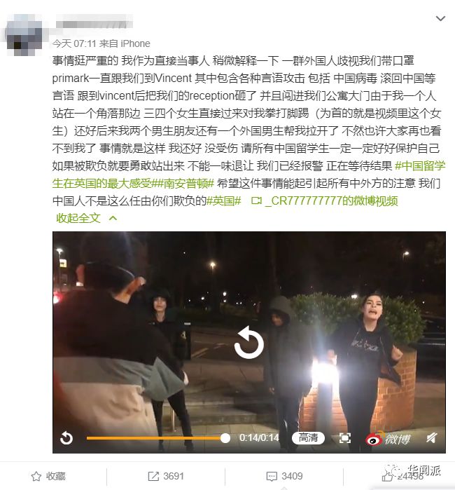 我們一邊走,他們還一邊罵我們。我指着其中一個瘦高的男孩,讓他跟我道歉。但是他不僅不道歉,還多次強調他們“live here”,用一種優越的語氣跟我們講。**還説就是我們帶了新冠病毒,還指着我一個戴着口罩的朋友説她有新冠。**後來這個男孩就衝進Primark抽出了條皮帶,啪啪抽了幾下,摔在地上,還一直嘲諷我們,跟我挑釁。