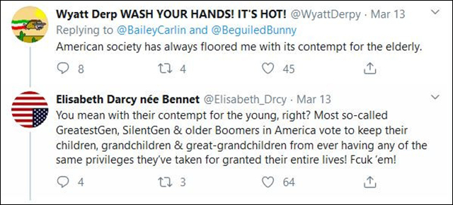 “美國社會對老人的蔑視總能折服我。”“你指的應該是對年輕人的蔑視才對吧?絕大多數所謂最偉大的世代(經歷一戰、二戰、大蕭條世代的人)、沉默的一代(1920-1940年出生的人)以及嬰兒潮一代的美國人,他們投票不讓他們的孩子、孫子、曾孫分享他們想當然地享有了一輩子的特權!讓他們去死吧!”