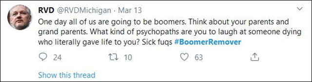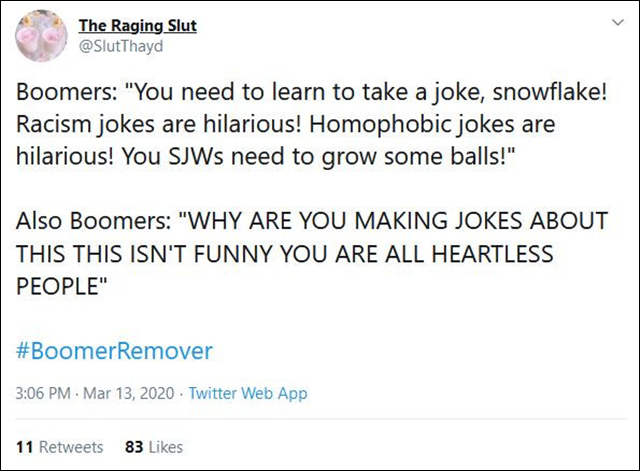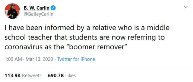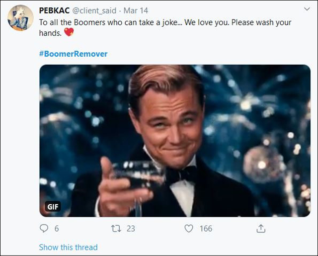 更讓人不可思議的是,疫情之下,西方社會的年輕羣體中出現了一種格外叛逆的聲音,稱新冠病毒是“老人消滅者”(Boomer Remover),“#BoomerRemover”的標籤一度也在推特上成為熱門話題。