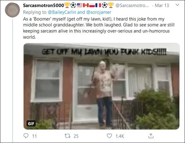 也有老人並不太在乎這個説法,“我自己就是個老人(別踩我的草坪,臭小鬼!),我從上中學的孫女那兒聽過這個笑話。我們都笑了。很高興在這個越來越過度嚴肅、沒有幽默感的世界裏,還能聽到一些挖苦的聲音。”