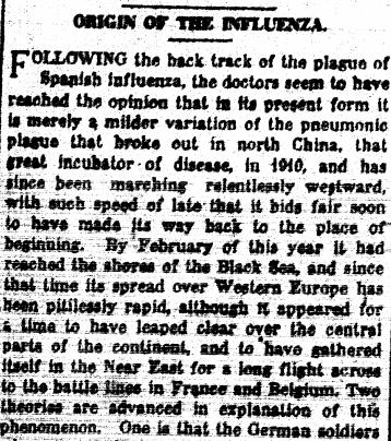 猶他晚報1918年10月22日有關流感起源的猜測,本文圖片除另有標註外,均由作者截圖自美國密西根大學圖書館1918年大流感媒體報道電子圖書館