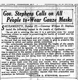 10月22日,市長拉爾夫發佈公告,勸告市民要佩戴口罩:良心、愛國主義和自我保護都要求立即而完全的遵守口罩佩戴要求。公告裏面甚至引用了意大利最高司令官印在口罩上的嚴厲警告:摘下口罩就會死亡。第二天(10月23日),加州州長斯蒂芬(William D.Stephens)也加入進來,在媒體上發表公開信呼籲民眾佩戴口罩,他畢竟是州長,將口罩防疫進一步拔高到了愛國主義。他稱,保護自己和同胞的身體健康是愛國責任,不戴口罩就是作為美國公民和忠誠的美國人不履行他的全部(愛國)責任的表現。