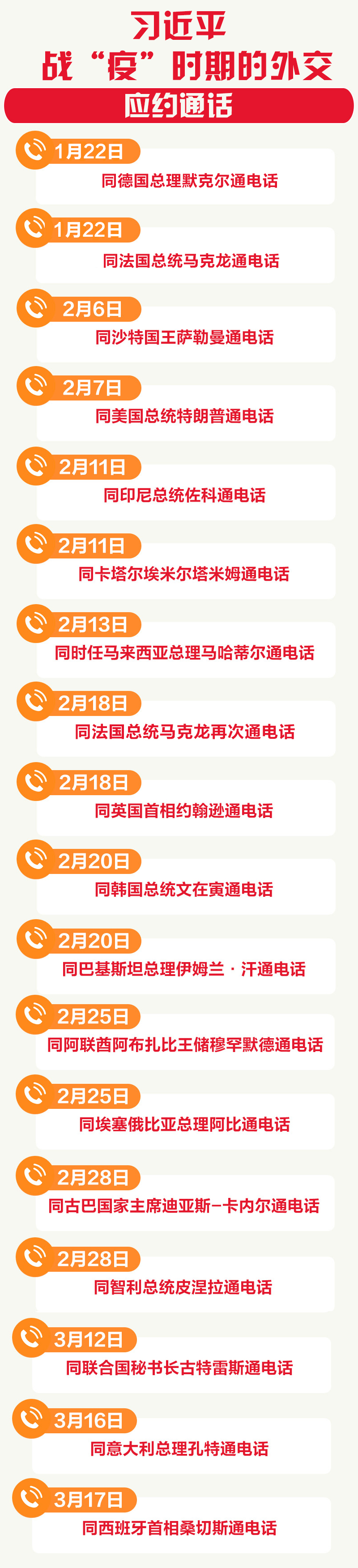 1月以來,習近平已18次同各國和國際組織領導人通電話。如此密集的“電話外交”,前所未有。在與各方的溝通交流中,習近平向國際社會傳遞了三點信息,一是表達感謝。疫情發生後,這些國家和國際組織給予中方寶貴的理解和支持,習近平向各方表示感謝。二是傳遞信心。一方面,習近平始終強調,疫情發生以來,中國採取了最嚴格的防控舉措,打響了一場疫情防控的人民戰爭,中國有信心、有能力、有把握打贏這場疫情防控阻擊戰。另一方面,習近平表示,中國經濟長期向好發展的趨勢不會改變。三是展現擔當。習近平在電話中強調,中國將繼續本着人類命運共同體理念,同國際社會加強合作,共同戰勝疫情。
