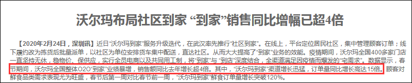 隨後,其官網在2月24日披露:春節期間,沃爾瑪在華整體O2O“到家”業績暴增,銷售額同比增長超4倍。其中,“沃爾瑪到家”渠道增長迅猛,訂單量同比增長高達15倍。春節後第一週對比春節前一週,“沃爾瑪到家”鮮食訂單量增長突破120%。