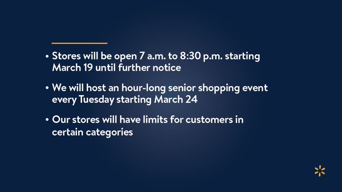 面對這樣的情況,沃爾瑪不得不發佈通告,從當地時間3月19日開始,營業時間改為早7點至晚8點半,縮短近一半(觀察者網注:美國沃爾瑪一般為24小時營業)。