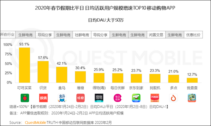 從行業上看,據QuestMobile《中國移動購物漢沽額”戰疫“專題報告》,此前日活僅800萬的生鮮電商APP,在春節期間突破了1000萬,節後再次攀升到1200萬。