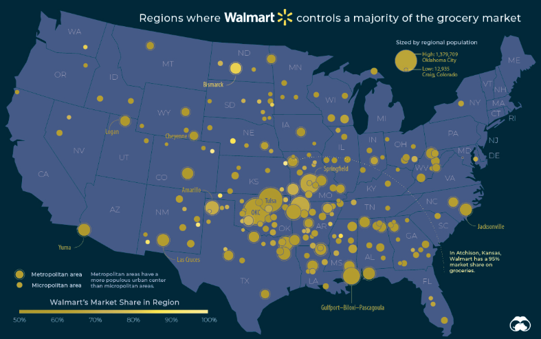 觀察者網梳理發現,沃爾瑪在美國的零售市場中佔據主導地位,市場份額達三成多;數據顯示,沃爾瑪在部分地區近乎壟斷,份額達80%以上。