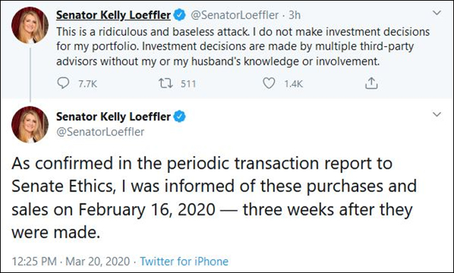 “這是一次荒謬而無據的攻擊。我並沒有對我的投資組合做出投資決定。投資決定是由多個第三方顧問做出的,我和我丈夫都不瞭解,也沒有參與其中。”“正如呈給參議院道德委員會的定期交易報告所確認的,我得知這些交易的日期是2020年2月16日——他們完成交易的三個星期以後。”