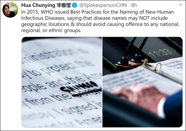 “2015年,世界衞生組織發佈《命名新型人類傳染病的最佳實踐》,文件顯示,疾病名稱中應避免出現地理位置,應避免對任何國家、區域或種族羣體造成冒犯。”