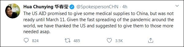 (觀察者網訊)外交部發言人華春瑩20日在推特火力全開,回應美國無端指責後,21日,她再次發推表示,“美國國際開發署(USAID)曾承諾向中國提供一些醫療用品,但直到3月11日才告訴中方準備好物資。鑑於疫情在世界範圍內迅速蔓延,我們已經向美國表示感謝,並建議儘快將這些東西提供給那些需要的人。”(注:美國國際開發署是承擔美國大部分對外非軍事援助的聯邦政府機構)