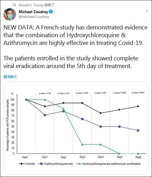 隨後,特朗普還轉發了共和黨評論員、企業家邁克爾·考德雷的推文,後者聲稱一項來自法國的研究表明,羥氯喹和阿奇黴素對治療新冠肺炎患者十分有效,患者在接受治療的第5天左右,新冠病毒便完全消除。