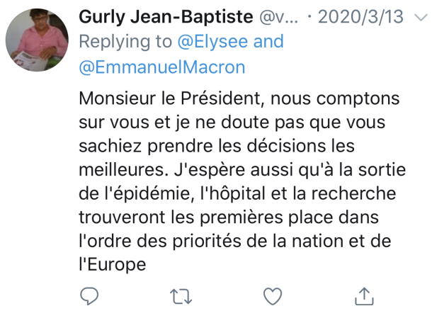 網友Gurly Jean-Baptiste:總統先生,我們相信您,我不懷疑您會採取更好的措施和決定。但我希望疫情結束後,醫院和醫學研究在法國和歐洲能作為最重要的領域優先發展。