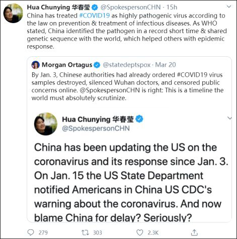 這條推文隨即獲得1萬多點贊和1800條轉推。然而美國國務院發言人、前“福克斯”新聞嘉賓摩根·奧塔格斯(Morgan Ortagus)卻在轉發時宣稱:“到1月3日,中國已下令銷燬新冠病毒(COVID19)樣本,讓武漢醫生們噤聲,並審查網上公眾普遍關注的問題”,摩根還@華春瑩 諷刺説“她是對的”:“這是一個世界必須絕對仔細審視的時間表。”