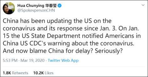 對於美國國務卿蓬佩奧指責中國拖延公佈新冠肺炎疫情,華春瑩19日在推特上發文,強調中方自1月3日以來一直向美方提供有關信息。1月15日,美國國務院也發出警告。她接着反問:“現在(美國)指責中國拖延?是認真的嗎?”