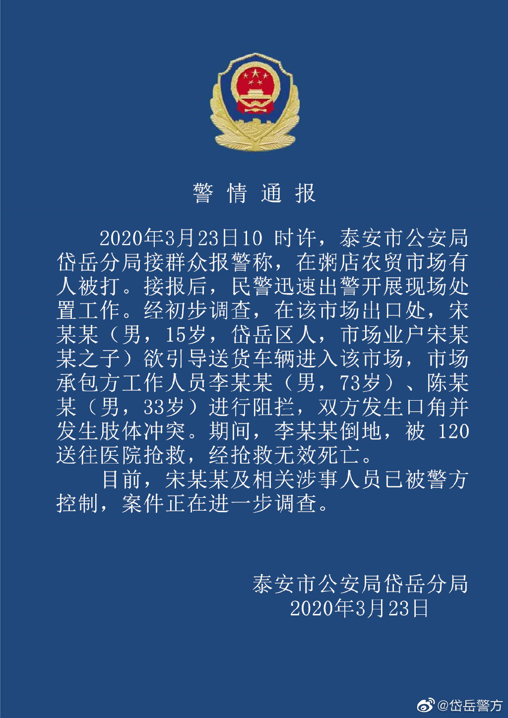 2020年3月23日,山東省泰安市岱嶽區粥店農貿市場內發生一起強闖疫情防控卡點並毆打工作人員並致死事件。當天晚上,@岱嶽警方 發佈警情通報稱,相關人員已被控制。