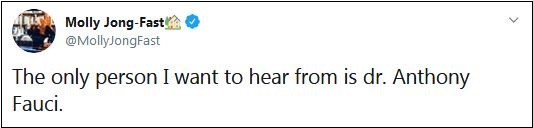 新聞網站“每日野獸”編輯茉莉·法斯特表示:“我唯一想聽的人,就是福奇博士。”